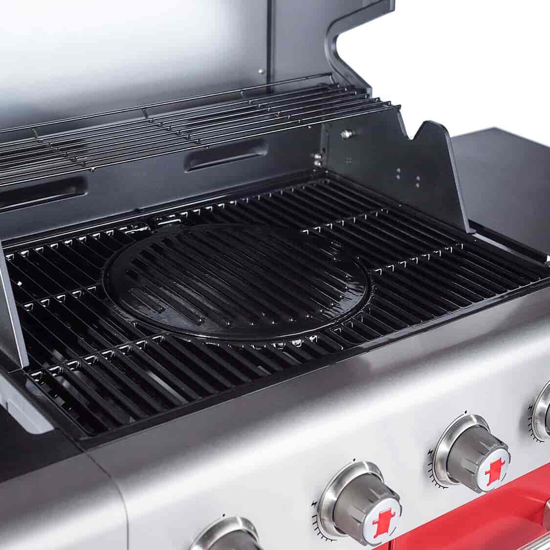 You've got the hybrid system that lets you cook with gas or chuck in some charcoal using the charcoal basket that comes with it - even lighting the charcoal with gas so you don't have to mess around. Plus the thing is integrated with the "Multi-Cooking Surface (MCS)" system which lets you easily swap the porcelain-coated cast iron grill for a pizza stone, a griddle a paella/skillet pan and who knows what else - meaning you can knock up a whole heap of different meals on this thing.